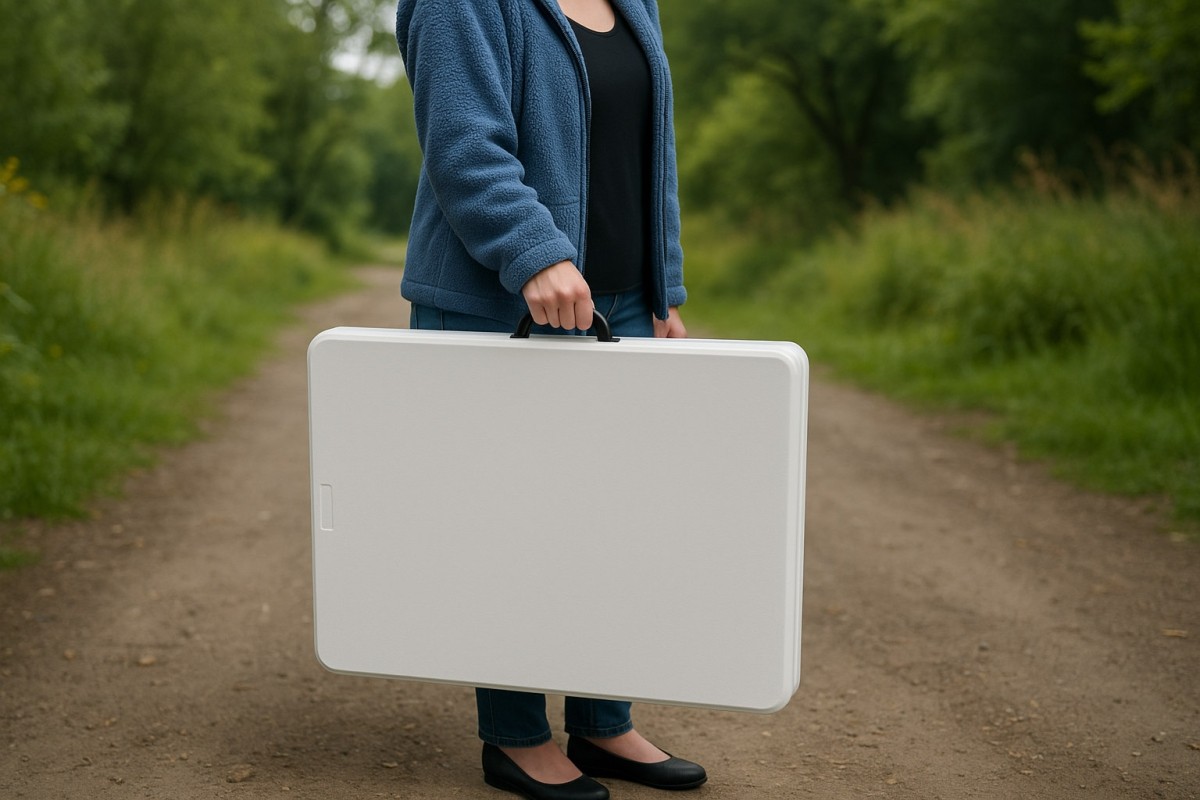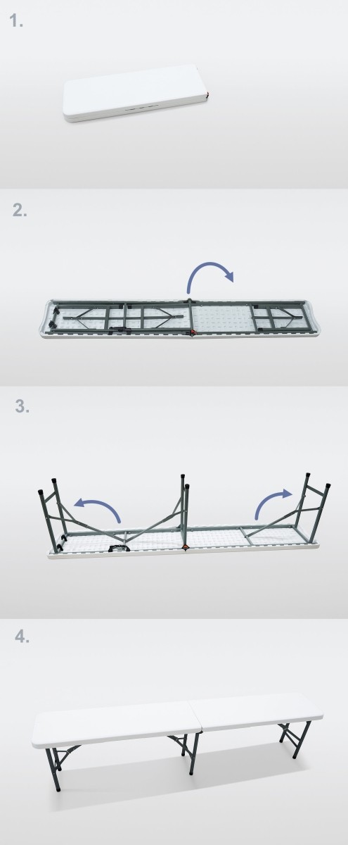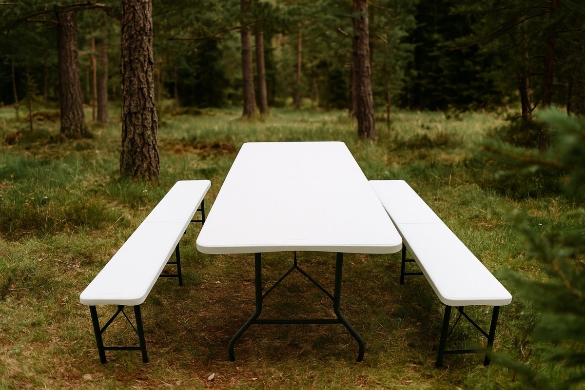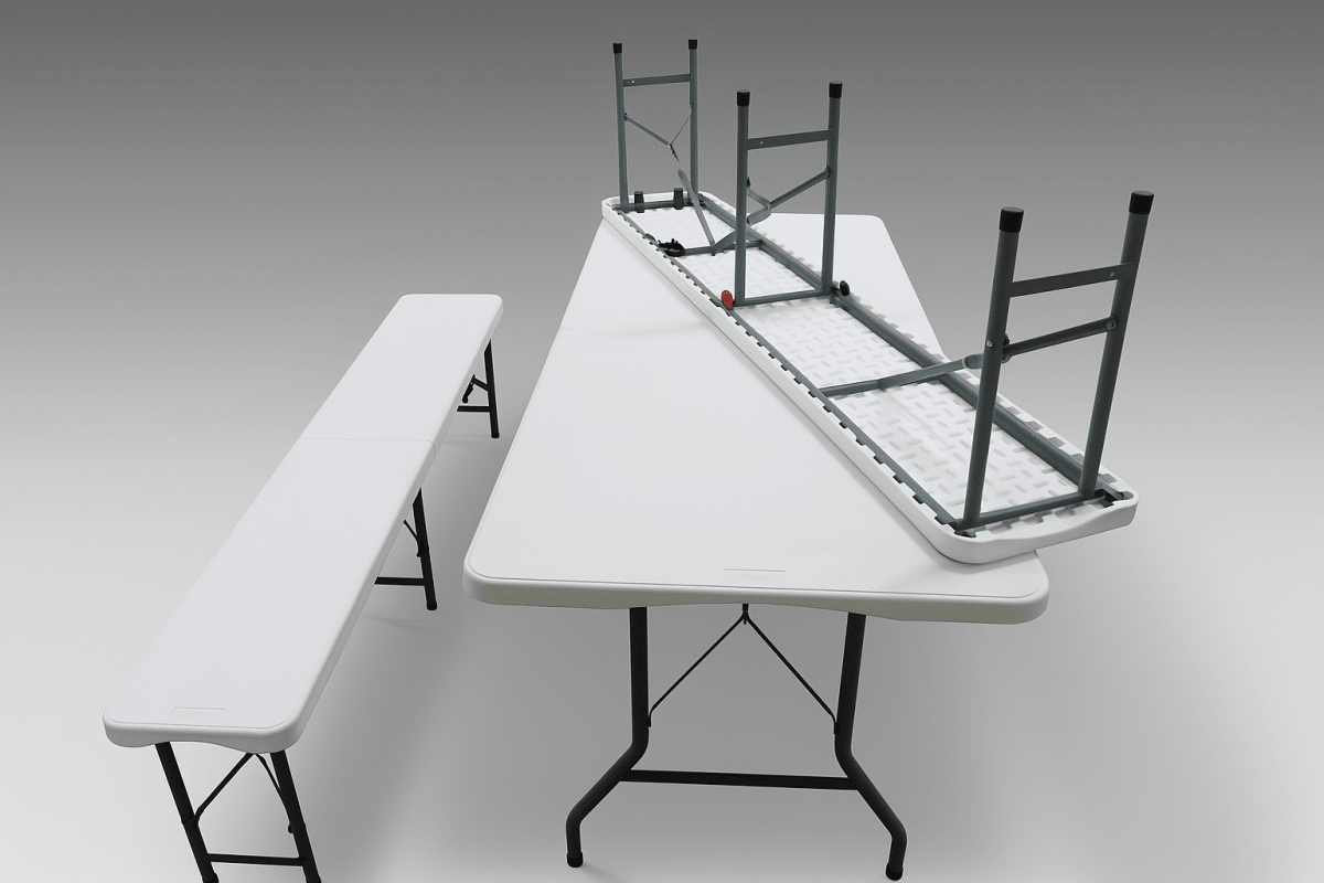 Sowohl die klappbare Kunststoffbank als auch der klappbare Kunststofftisch verfügen über ein einfaches Klappsystem. Zusammengeklappt nehmen sie nur wenig Platz ein – ideal für den Transport im Auto oder die platzsparende Lagerung.