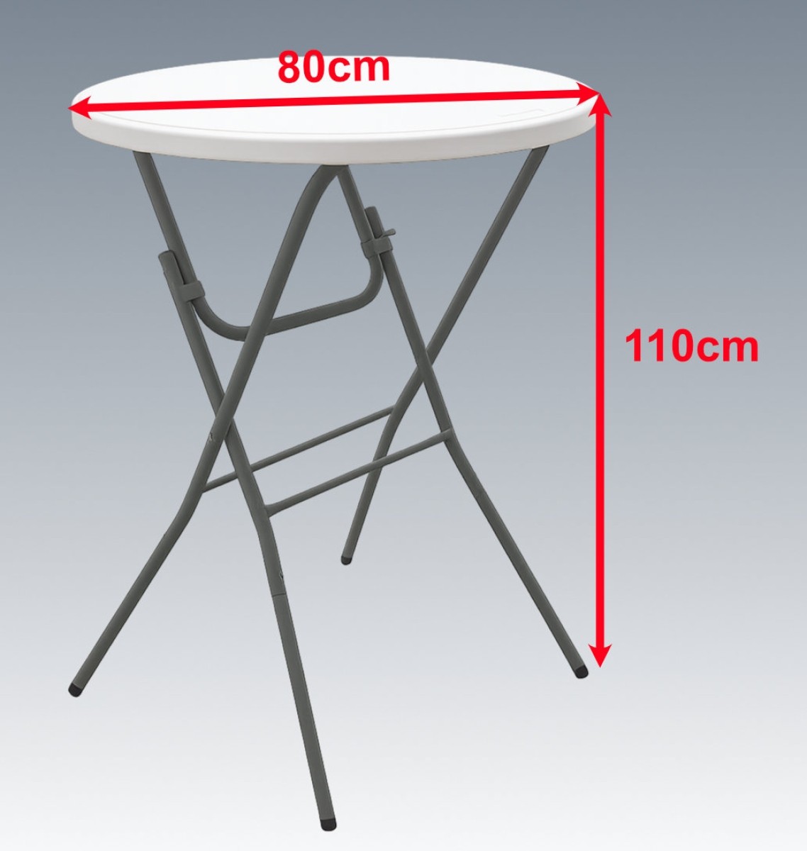 Der Tischdurchmesser beträgt 80 cm, die Höhe 110 cm.